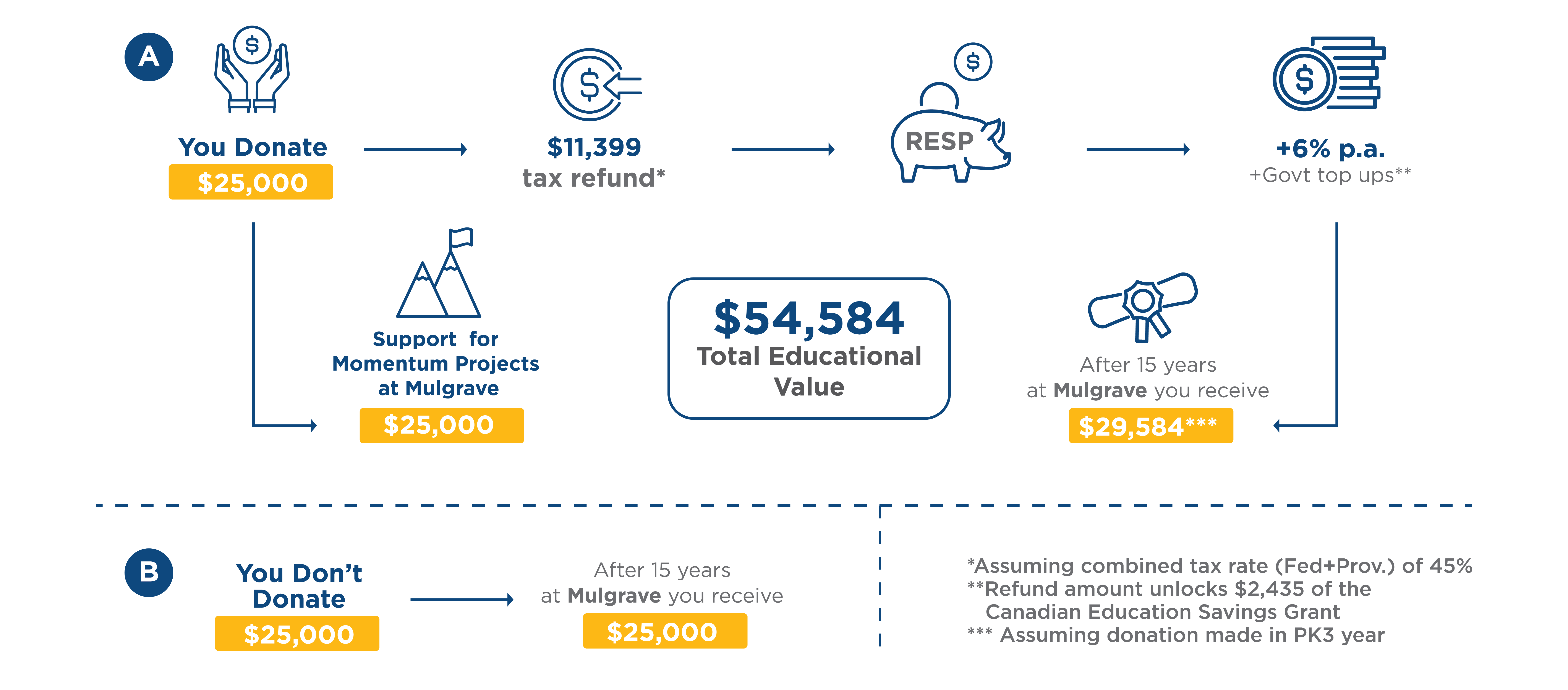 Thanks to government top up incentives, you could further leverage your tax refund by investing the money in a RESP to support your child’s future post secondary education. Take a look at this example of a PK3 family: even with a conservative 6% annual growth on their investment, they more than make back the original donation, in addition to their positive impact on Mulgrave students.